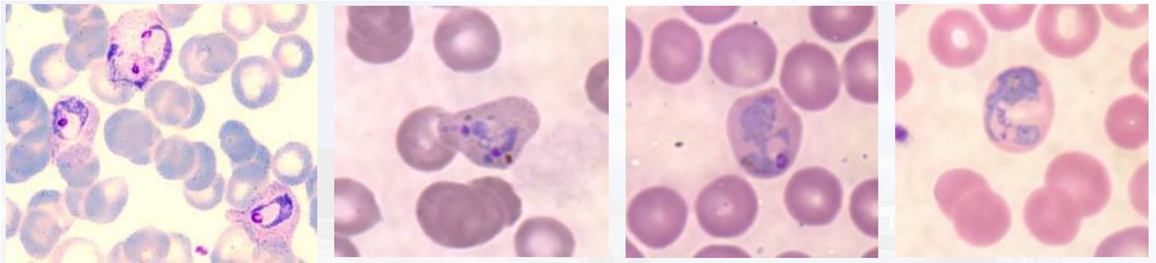胞浆:不规则,蓝色,出现伪足,有空泡。