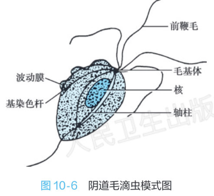 阴道毛滴虫仅有滋养体一个形态阶段,活体无色透明,有折光性,体态多变,活动力强。固定染色后虫体呈梨形,体长可达30μm,宽10~15μm。前端有一个泡状核,核上缘有5颗排列成环状的毛基体,由此发出5根鞭毛,分别为4根前鞭毛和1根后鞭毛。滋养体有轴柱1根,纤细透明,纵贯虫体,自后端伸出体外。虫体外侧前1/2处,有一波动膜,其外缘与向后延伸的后鞭毛相连。虫体借助鞭毛摆动前进,并借助波动膜的波动做旋转式运动。胞质内有深染的颗粒,为该虫特有的氢化酶体(hydrogenosome)