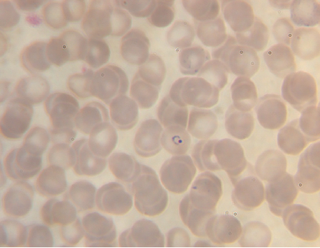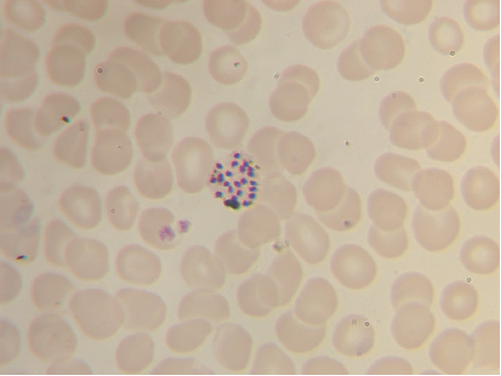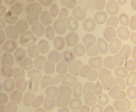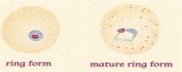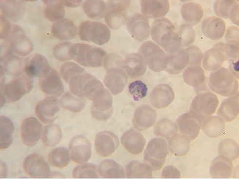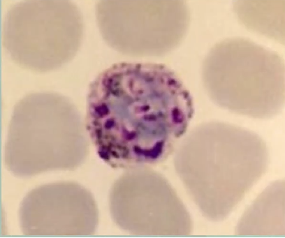 雌配子体核小致密,深红色,多偏于虫体一侧。疟色素均匀分布。