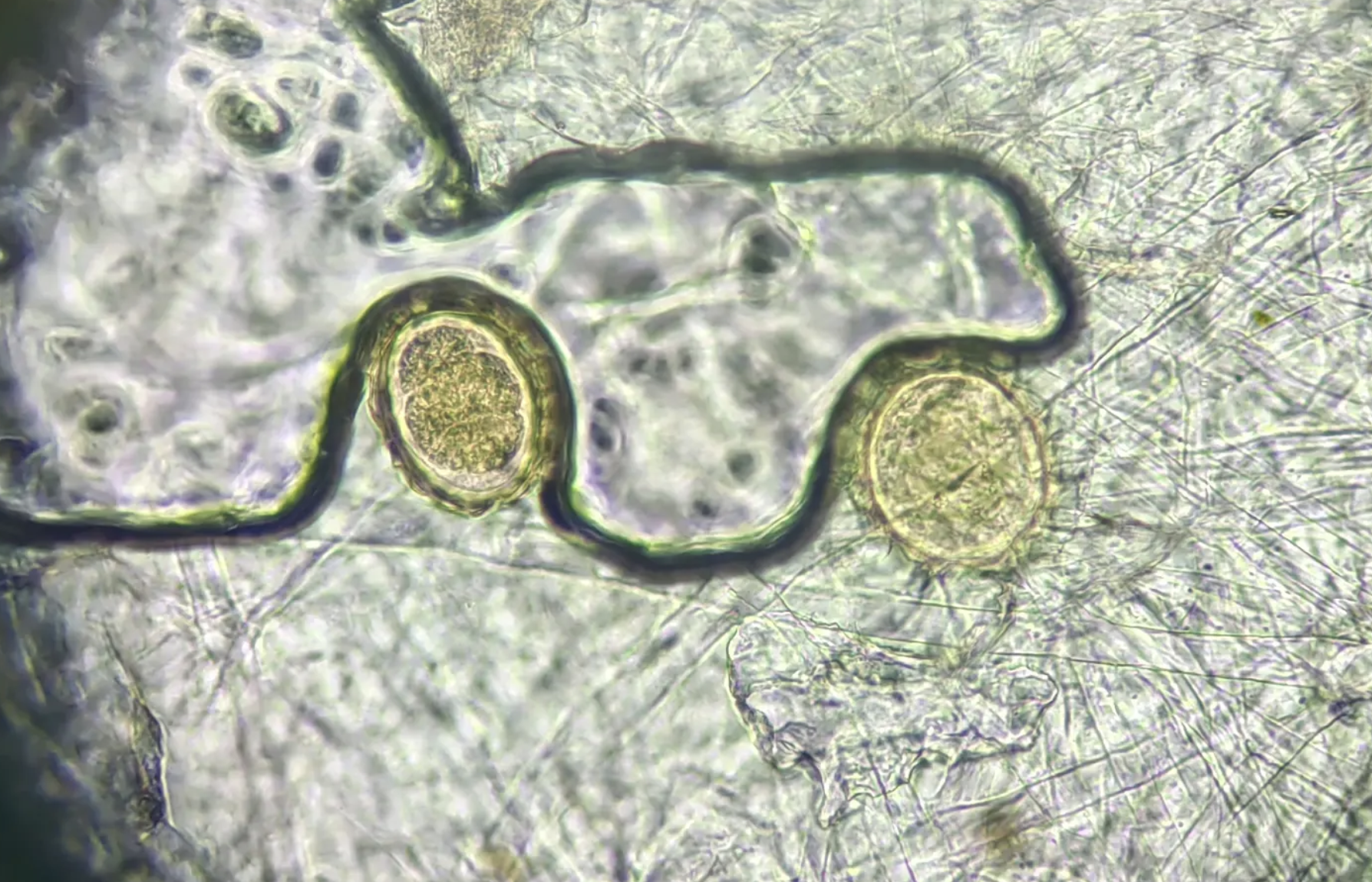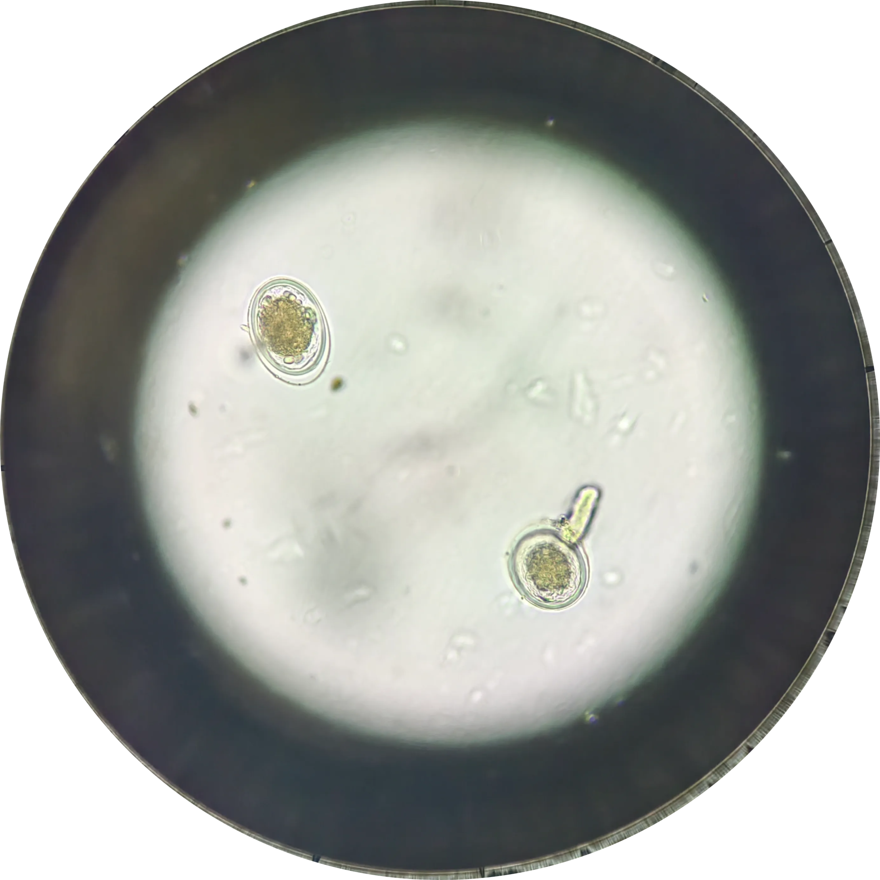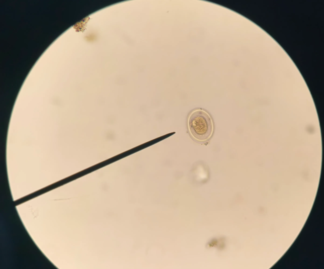 虫卵呈纺锤形或腰鼓形, 大小(50~54)μm x (22~23)μm,棕黄色, 卵壳较厚,两端各有一透明塞状突起。虫卵随粪便排出时,卵内有1个尚未分裂的细胞。