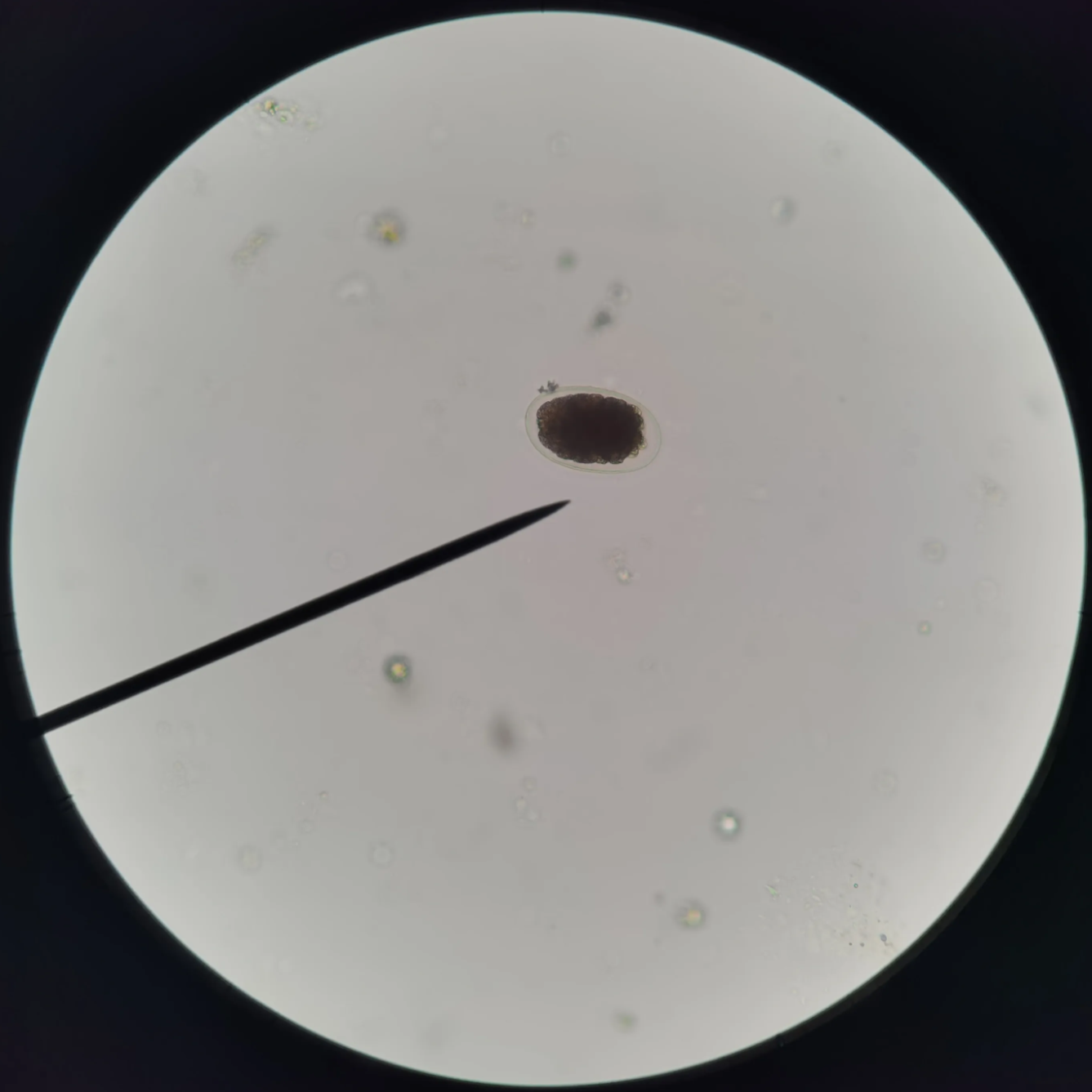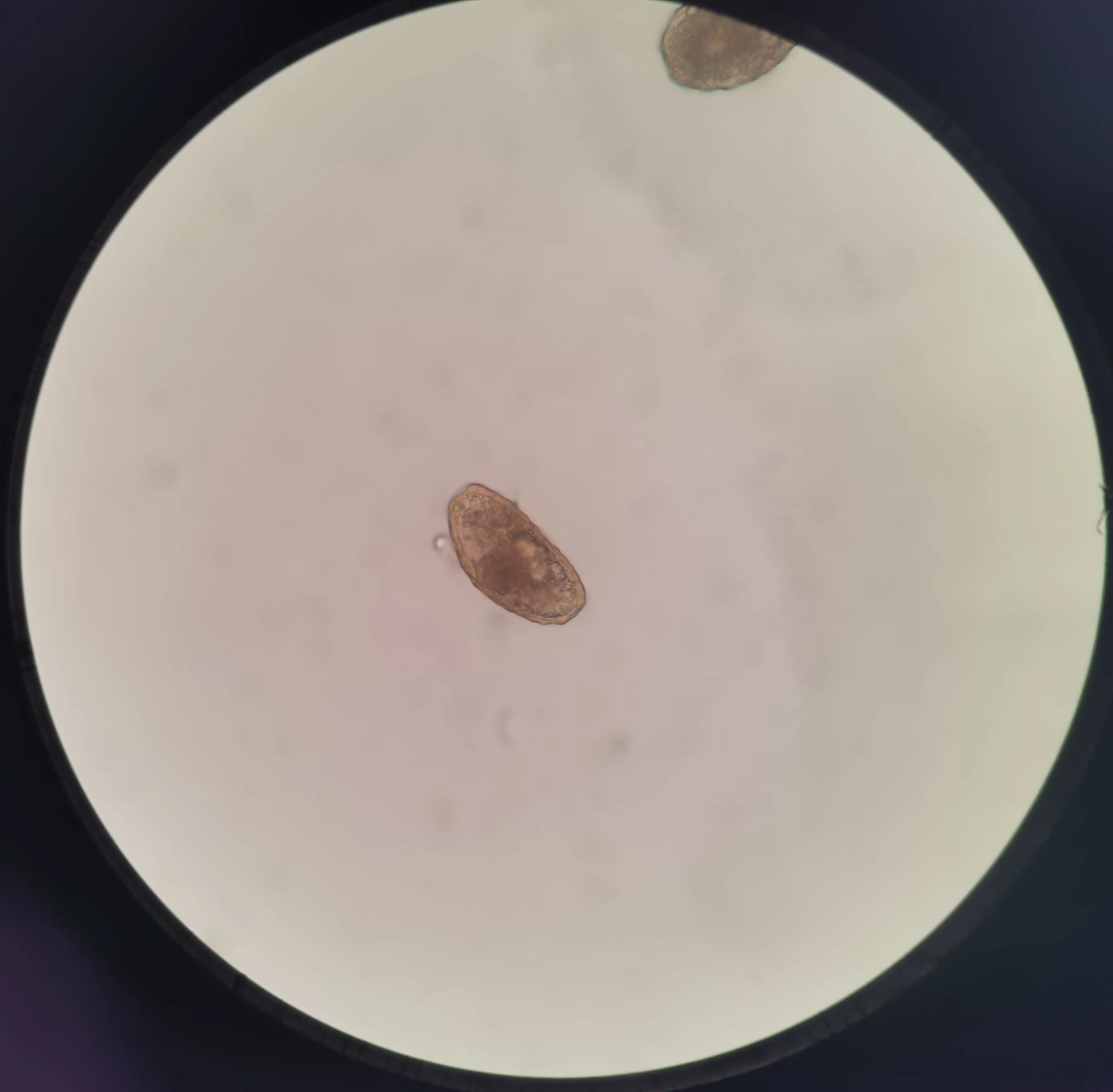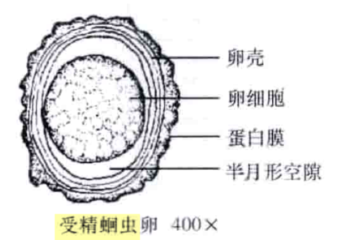 受精卵呈宽椭圆形,大小为(45~75) m×(35~50)wm。卵壳较厚。卵壳外常有一层由子宫分泌物形成的凹凸不平的蛋白质膜,被宿主胆汁染成棕黄色,卵内含有1个大而圆的受精卵细胞,在其两端与卵壳间可见新月形空隙。