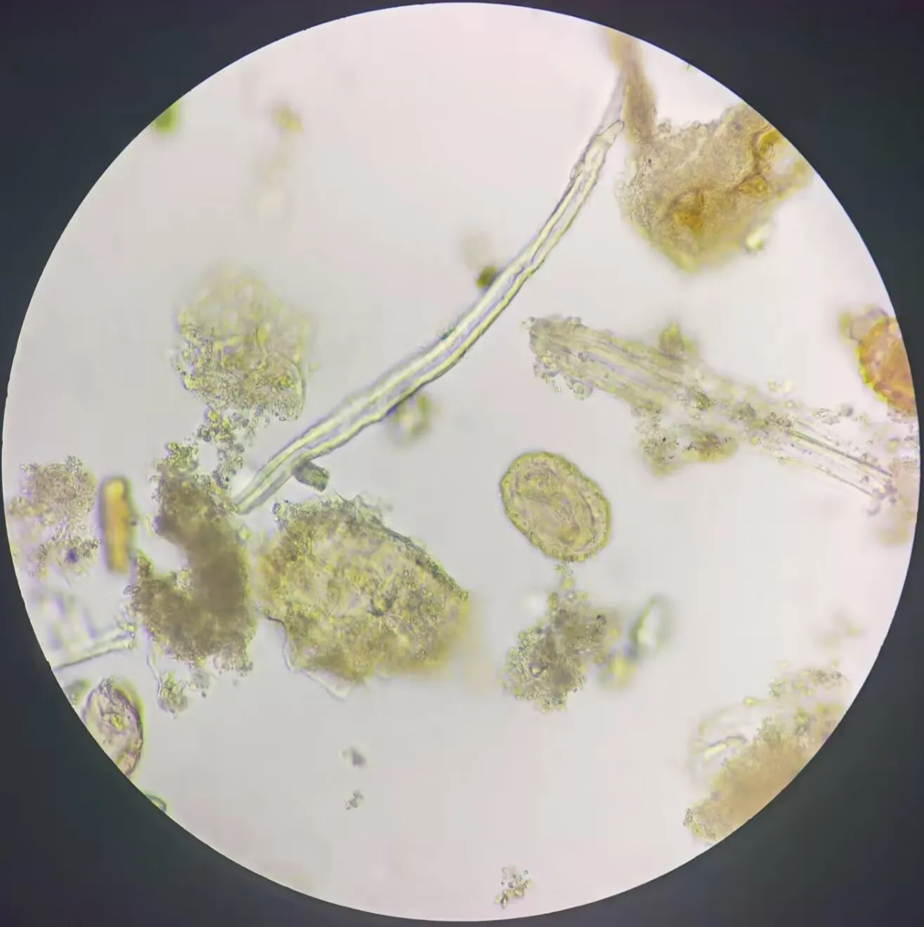 钩虫卵 壳薄,透明,多细胞,间隙明显