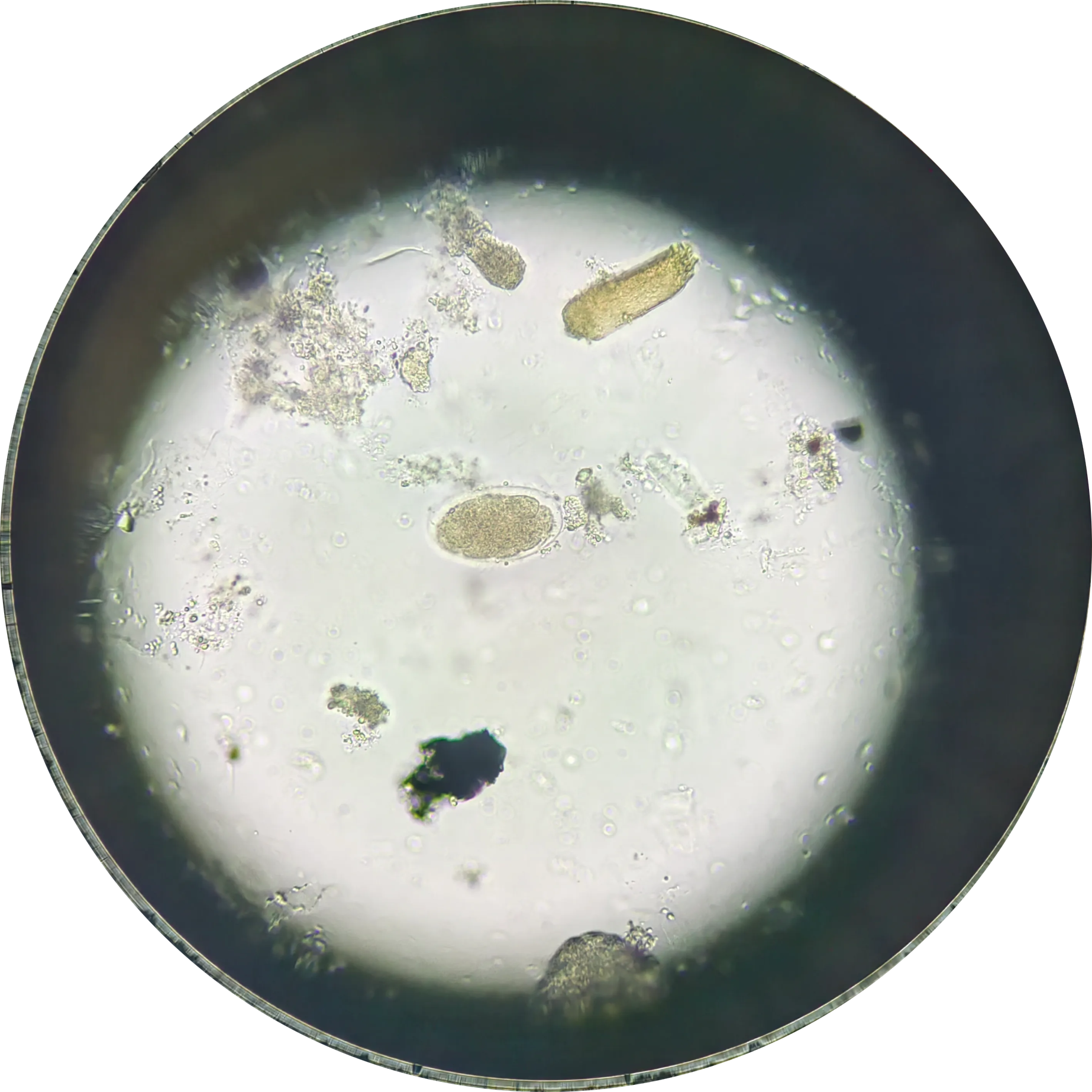 椭圆形,大小(57~76)μm× (36~40)μm,两端钝圆。卵壳较薄, 无色透明,卵内通常含2~4个卵细胞, 卵壳与卵细胞之间有明显空隙。在便秘者粪便内或粪便放置过久时,卵内细胞可继续分裂成桑葚状。两种钩虫卵形态相似,不易区别。