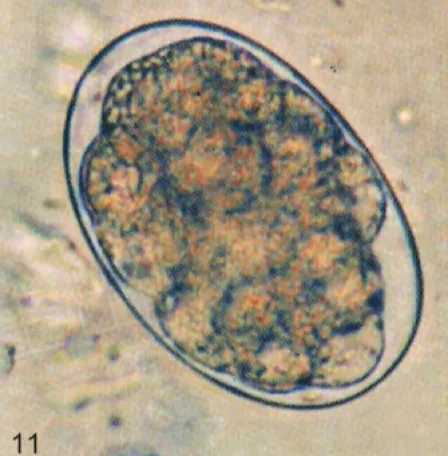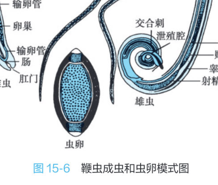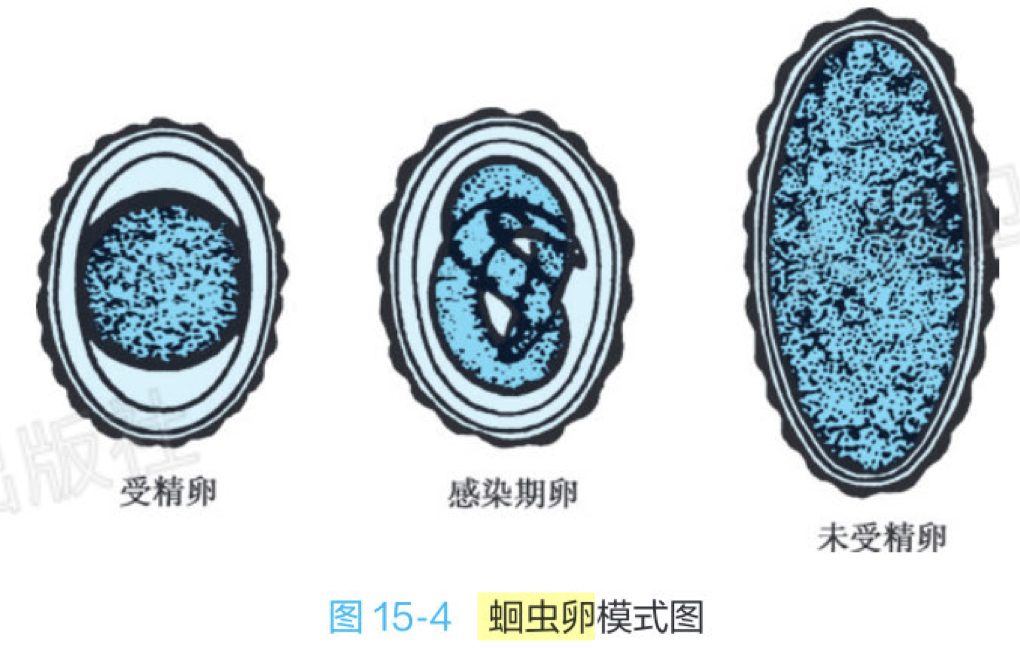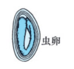 虫卵无色透明,长椭圆形,两侧不对称,一侧扁平,另一侧稍凸,大小(50~60)um x (20~30)um,卵壳较厚,刚产出的虫卵内含一蝌蚪期胚胎[图 15-8,文末彩图2(12)]